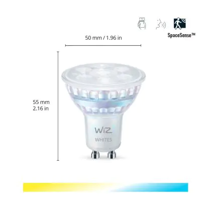 Die Doppelpack 2x WiZ Smart LED-Spot GU10 PAR16 5W 400lm 36D | Höchste Farbwiedergabe - Dimmbar - Ersatz Für 50W ist eine effiziente GU10 LED-Lampe und der perfekte Ersatz für Ihre konventionelle Halogenlampe mit 50W und einem GU10-Sockel, bei welchem die zwei Stifte einen Abstand von 10 mm zueinander haben. Zudem strahlt das Produkt Licht in der Farbtemperatur aus und punktet durch eine lange Lebensdauer.