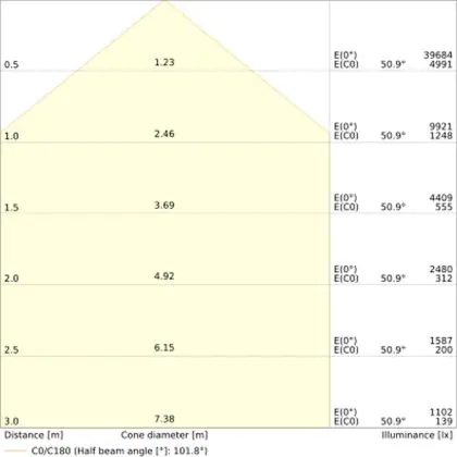 Der Abstrahlwinkel bezeichnet den Winkel, in dem das Licht aus der Lichtquelle ausgestrahlt wird. Er wird in Grad (D) angegeben. Je geringer die Gradzahl des Abstrahlwinkels ist, desto kleiner ist auch der Durchmesser des Lichtkegels, den die Lichtquelle produziert. Beispiel: Wird eine Lampe mit einem Abstrahlwinkel von 60 Grad an der Decke (2,5 m Höhe) angebracht, erzeugt sie einen Lichtkegel von 2,9 Metern Durchmesser. Hat die Lampe hingegen einen Abstrahlwinkel von 120 Grad, beträgt der Lichtkegel 8,7 Meter im Durchmesser. |