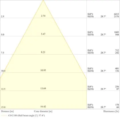 Der Abstrahlwinkel bezeichnet den Winkel, in dem das Licht aus der Lichtquelle ausgestrahlt wird. Er wird in Grad (D) angegeben. Je geringer die Gradzahl des Abstrahlwinkels ist, desto kleiner ist auch der Durchmesser des Lichtkegels, den die Lichtquelle produziert. Beispiel: Wird eine Lampe mit einem Abstrahlwinkel von 60 Grad an der Decke (2,5 m Höhe) angebracht, erzeugt sie einen Lichtkegel von 2,9 Metern Durchmesser. Hat die Lampe hingegen einen Abstrahlwinkel von 120 Grad, beträgt der Lichtkegel 8,7 Meter im Durchmesser. |