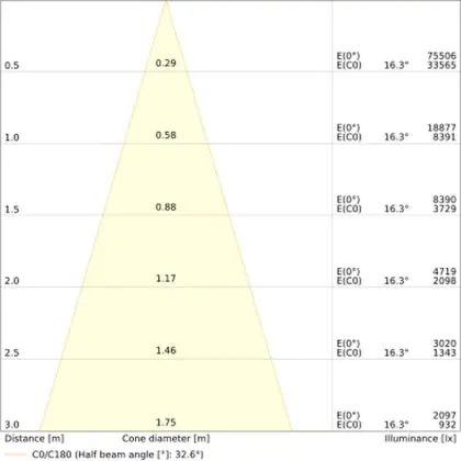 Der Abstrahlwinkel bezeichnet den Winkel, in dem das Licht aus der Lichtquelle ausgestrahlt wird. Er wird in Grad (D) angegeben. Je geringer die Gradzahl des Abstrahlwinkels ist, desto kleiner ist auch der Durchmesser des Lichtkegels, den die Lichtquelle produziert. Beispiel: Wird eine Lampe mit einem Abstrahlwinkel von 60 Grad an der Decke (2,5 m Höhe) angebracht, erzeugt sie einen Lichtkegel von 2,9 Metern Durchmesser. Hat die Lampe hingegen einen Abstrahlwinkel von 120 Grad, beträgt der Lichtkegel 8,7 Meter im Durchmesser. |