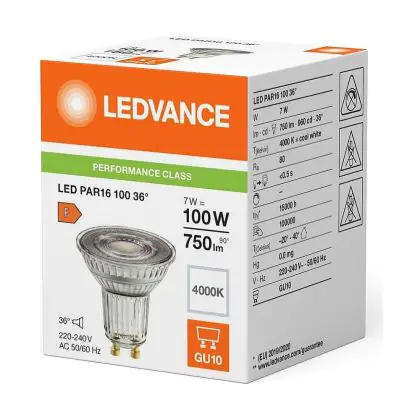 Die Mehrfachpackung 10x Ledvance LED PAR16 GU10 Reflektor 7W 750lm 36D - 840 Kaltweiß | Ersatz Für 80W ist eine effiziente GU10 LED-Lampe und der perfekte Ersatz für Ihre konventionelle Halogenlampe mit 80W und einem GU10-Sockel, bei welchem die zwei Stifte einen Abstand von 10 mm zueinander haben. Zudem strahlt das Produkt Licht in der Farbtemperatur aus und punktet durch eine lange Lebensdauer.