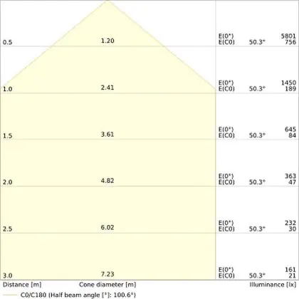 Der Abstrahlwinkel bezeichnet den Winkel, in dem das Licht aus der Lichtquelle ausgestrahlt wird. Er wird in Grad (D) angegeben. Je geringer die Gradzahl des Abstrahlwinkels ist, desto kleiner ist auch der Durchmesser des Lichtkegels, den die Lichtquelle produziert. Beispiel: Wird eine Lampe mit einem Abstrahlwinkel von 60 Grad an der Decke (2,5 m Höhe) angebracht, erzeugt sie einen Lichtkegel von 2,9 Metern Durchmesser. Hat die Lampe hingegen einen Abstrahlwinkel von 120 Grad, beträgt der Lichtkegel 8,7 Meter im Durchmesser. |