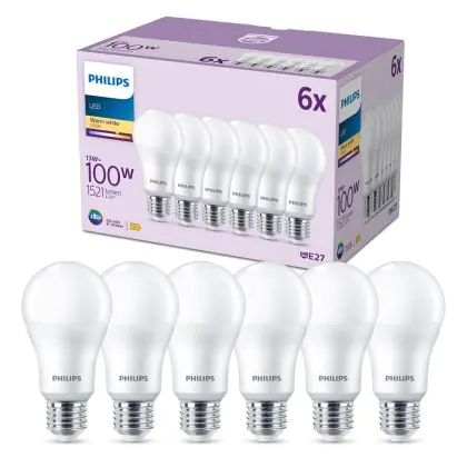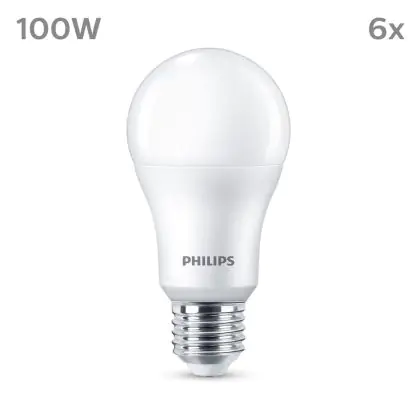 Die Mehrfachpackung 6x Philips Glühbirne LED E27 Birne Matt 13W 1521lm - 827 Extra Warmweiß ist eine effiziente E27 LED-Lampe und der perfekte Ersatz für Ihre konventionellen W Lampen mit E27-Sockel. Zudem strahlt sie Licht in der Farbtemperatur 2700K - Extra Warmweiß aus und punktet durch eine lange Lebensdauer.