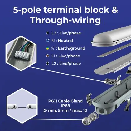 Die Noxion LED Feuchtraumleuchte Poseidon V3.0 30W 3900/4200lm - 830-865 CCT | 120cm - Durchgangsverdrahtung (5x2.5mm2) - Dali Dimmbar ist eine Feuchtraumleuchte. Sie strahlt Licht in der Farbtemperatur 3000K - 4000K - 6500K CCT aus und punktet durch eine lange Lebensdauer. Diese Leuchte ist speziell zur Verwendung in Feuchträumen (Keller, Waschräume, etc.) vorgesehen.