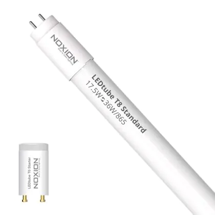 Die T8 LED-Röhren von Noxion gibt es in verschiedenen Farbtemperaturen: Extra Warmweiß (2.700 K und weniger), Warmweiß (3.000 K), Kaltweiß (4.000 K) und Tageslichtweiß (6.500 K). Diese Röhre strahlt ihr Licht in 6500K - Tageslichtweiß aus.