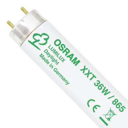 Die Osram Lumilux XXT T8 36W - 865 Tageslichtweiß | 120cm ist eine T8 Leuchtstoffröhre von Osram mit einer Länge von 1200 mm. Das Produkt verfügt über 2 Pins und hat einen Durchmesser von 26 mm. Die Röhre strahlt Licht in der Farbtemperatur 6500K - Tageslichtweiß aus und punktet durch eine lange Lebensdauer.