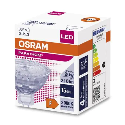 Die Osram Parathom LED-Spot GU5.3 MR16 3W 230lm 36D - 830 Warmweiß | Ersatz für 20W ist eine effiziente GU5.3 LED-Lampe und der perfekte Ersatz für Ihre konventionelle Halogenlampe mit 20W und einem GU5.3-Sockel, bei dem die beiden Stifte einen Abstand von 5,3 mm zueinander haben. Die Abkürzung MR16 zeigt Ihnen, dass der Reflektor einen Durchmesser von 5 cm hat. Zudem strahlt das Produkt Licht in der Farbtemperatur 3000K - Warmweiß aus und punktet durch eine lange Lebensdauer.