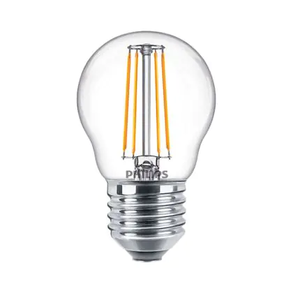 Die Philips Corepro LED Lustre E27 Kugel Fadenlampe Klar 4.3W 470lm - 827 Extra Warmweiß | Ersatz für 40W ist eine effiziente E27 LED-Lampe mit Retrodesign und der perfekte Ersatz für Ihre konventionellen 40W Lampen mit E27. Zudem strahlt sie Licht in der Farbtemperatur 2700K - Extra Warmweiß aus und punktet durch eine lange Lebensdauer.