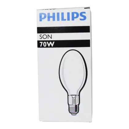 Philips SON Lampen sind Natriumdampf-Entladungslampen. Dies sind die sparsamen Standard Modelle. Sie bieten eine Lichtstrahlung von 130lm/W dank einer mit einem Gemisch aus Natrium, Quecksilber und Xenongas gefüllten Entladungsröhre. Philips SON 70W 220 I E27 Glühbirnen haben einen E27 Lampensockel und einen Durchmesser von 71mm.