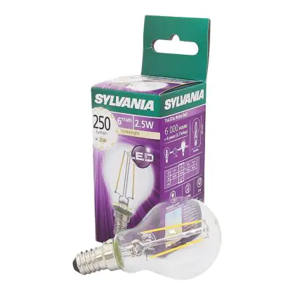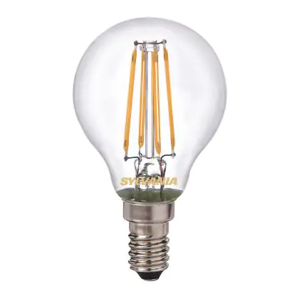 Die Sylvania ToLEDo Retro Ball E14 ist eine energieeffiziente LED-Lampe. Sie hat einen Eigenbedarf von nur 4 Watt, ersetzt dabei jedoch traditionelle Leuchtmittel von 40 Watt. Das ermöglicht eine Energieersparnis von 90 %. Darüber hinaus hat die LED einen E14-Sockel und ein kugelförmiges Design. Sie spendet extra warmweißes Licht mit einer Farbtemperatur von 2.700 Kelvin.